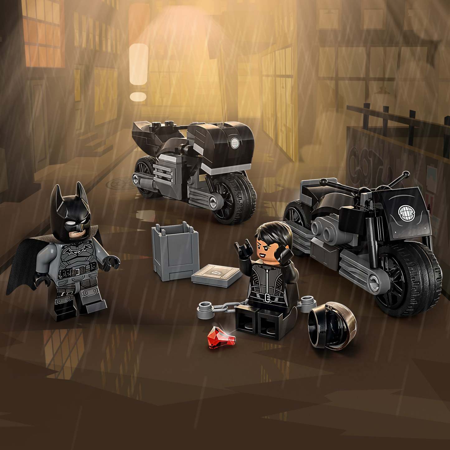 - 2 minifigures – Includes Batman™, with a fabric cape, and Selina Kyle™ minifigures, a Batarang™, grappling gun, chain, gem element and a glow-in-the-dark Batsignal™