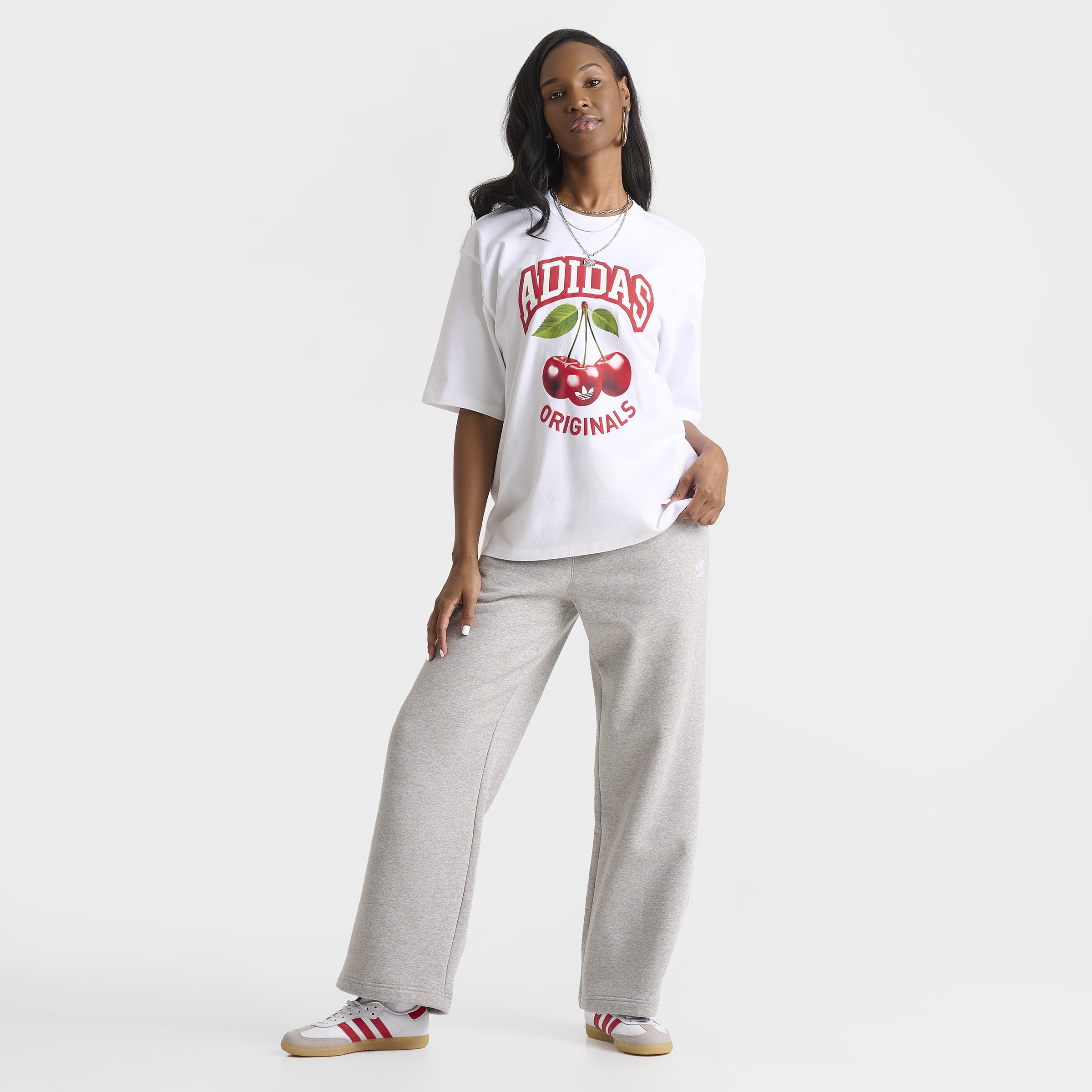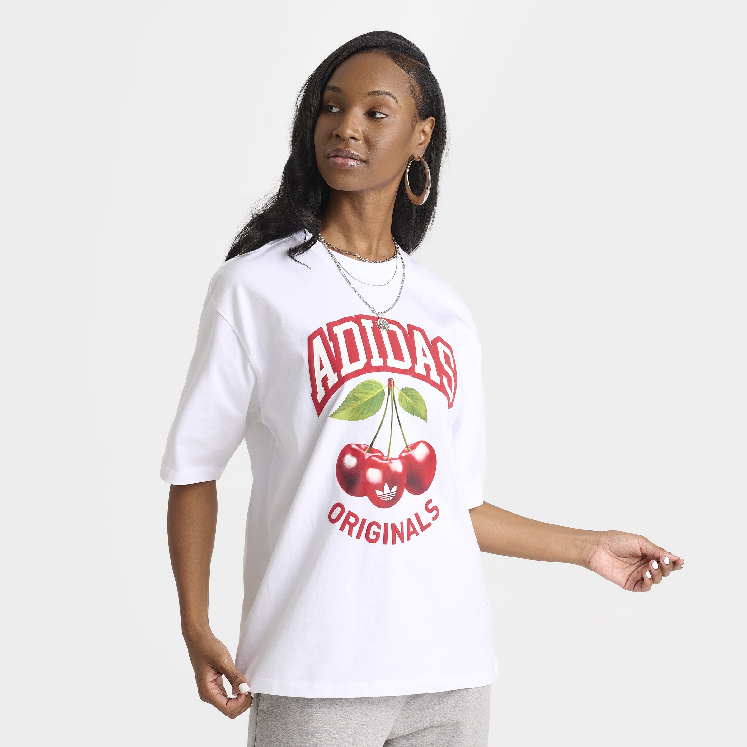 Top off your look with the adithtdas Women's Cherry Boyfriend T-Shirt. Made from ultra-soft cotton, this tee delivers a relaxed, roomy fit for effortless comfort. Featuring bold cherry graphics and signature 3-Stripes branding, it’s the perfect blend of sporty and sweet.