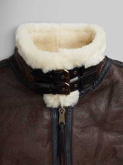 Inspired by the legendary WWII B-3 aviator jacket, this piece is designed to withstand extreme cold while maintaining a rugged, masculine aesthetic. The rich brown leather exterior, contrasting cream sherpa lining, and classic bomber silhouette make it a versatile statement jacket for both casual and high-fashion outfits.